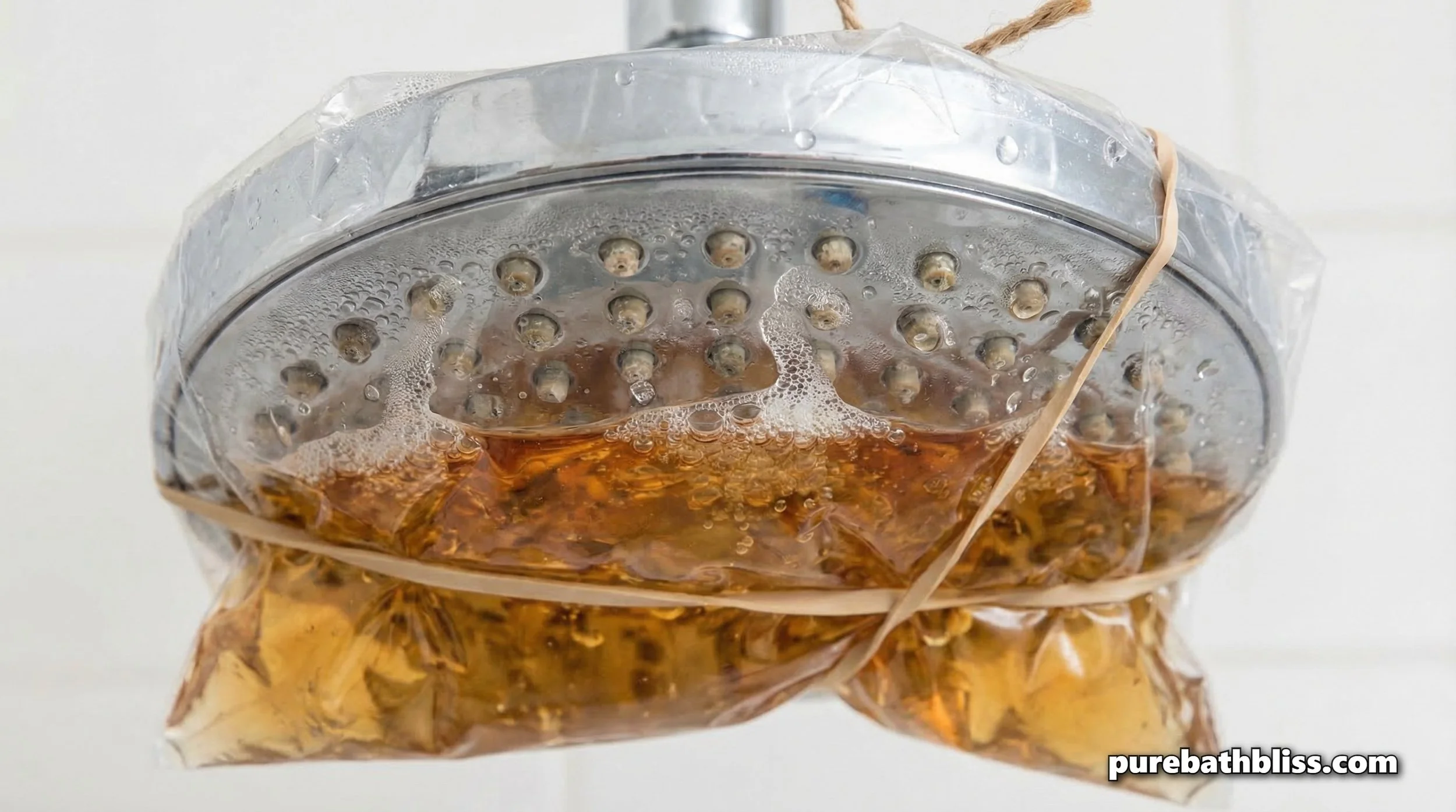 For spring cleaning, you don't even have to take the showerhead off the wall. Fill a plastic bag with white vinegar and a few drops of lemon juice, then use a rubber band to secure it over the showerhead so the nozzles are submerged. Leave it for at least four hours. The vinegar will dissolve the mineral "crust," restoring your water pressure and making your shower feel new again.