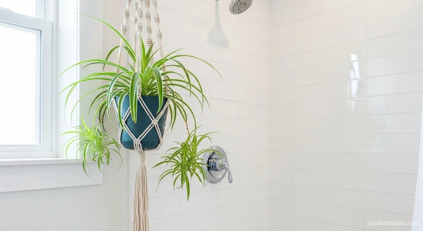 Perfect for Pothos, Spider Plants, and Peace Lilies. Keep out of direct spray (soap buildup burns leaves) but close enough for humidity.