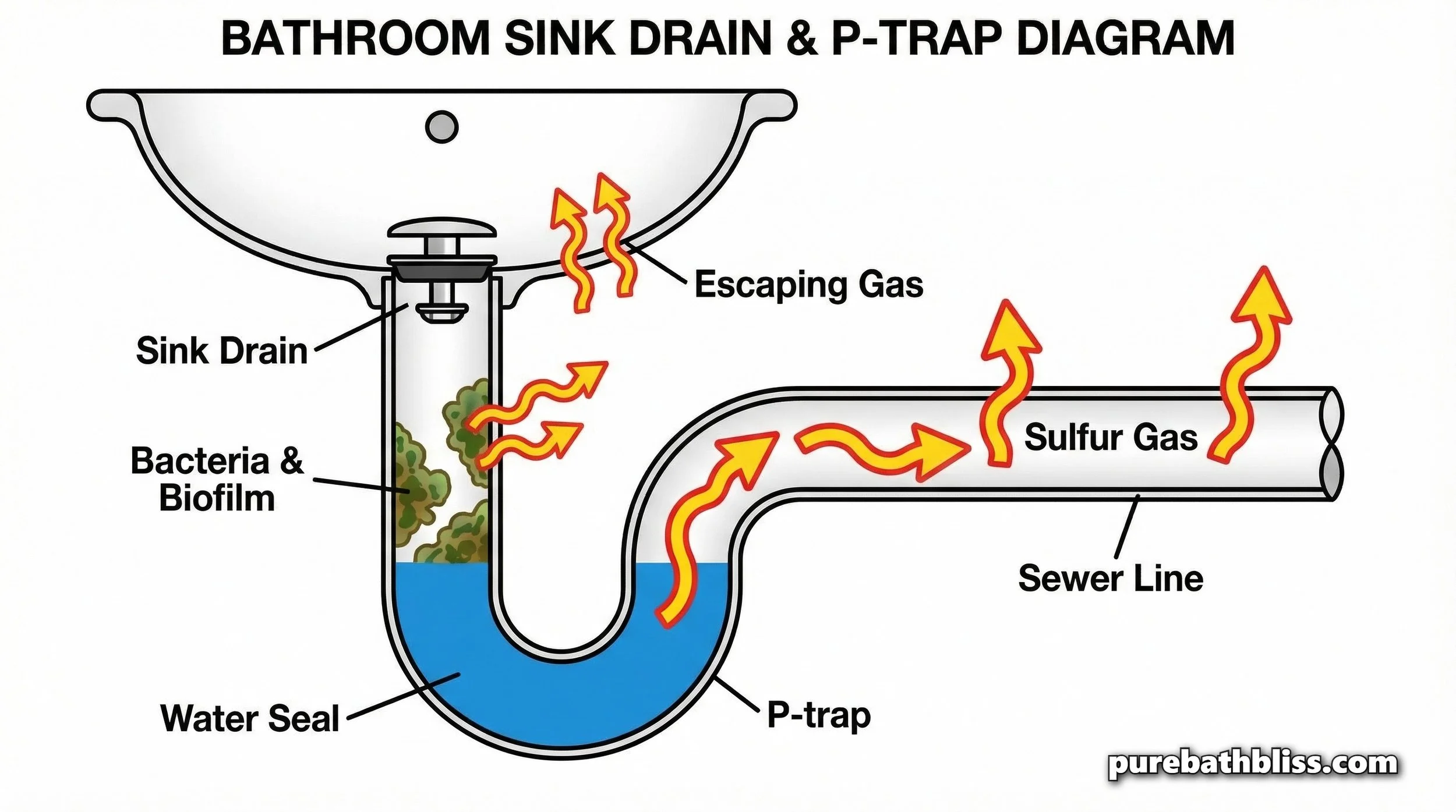 In a bathroom sink, these materials often get tangled together. Over time, they form a "biofilm" or a clog that sits inside your pipes. Because this area is dark and wet, bacteria thrive. As they "eat" the organic waste trapped in your drain, they release hydrogen sulfide gas. When you turn on the water, the air in the pipe is pushed upward, sending that gas directly into your nose.
