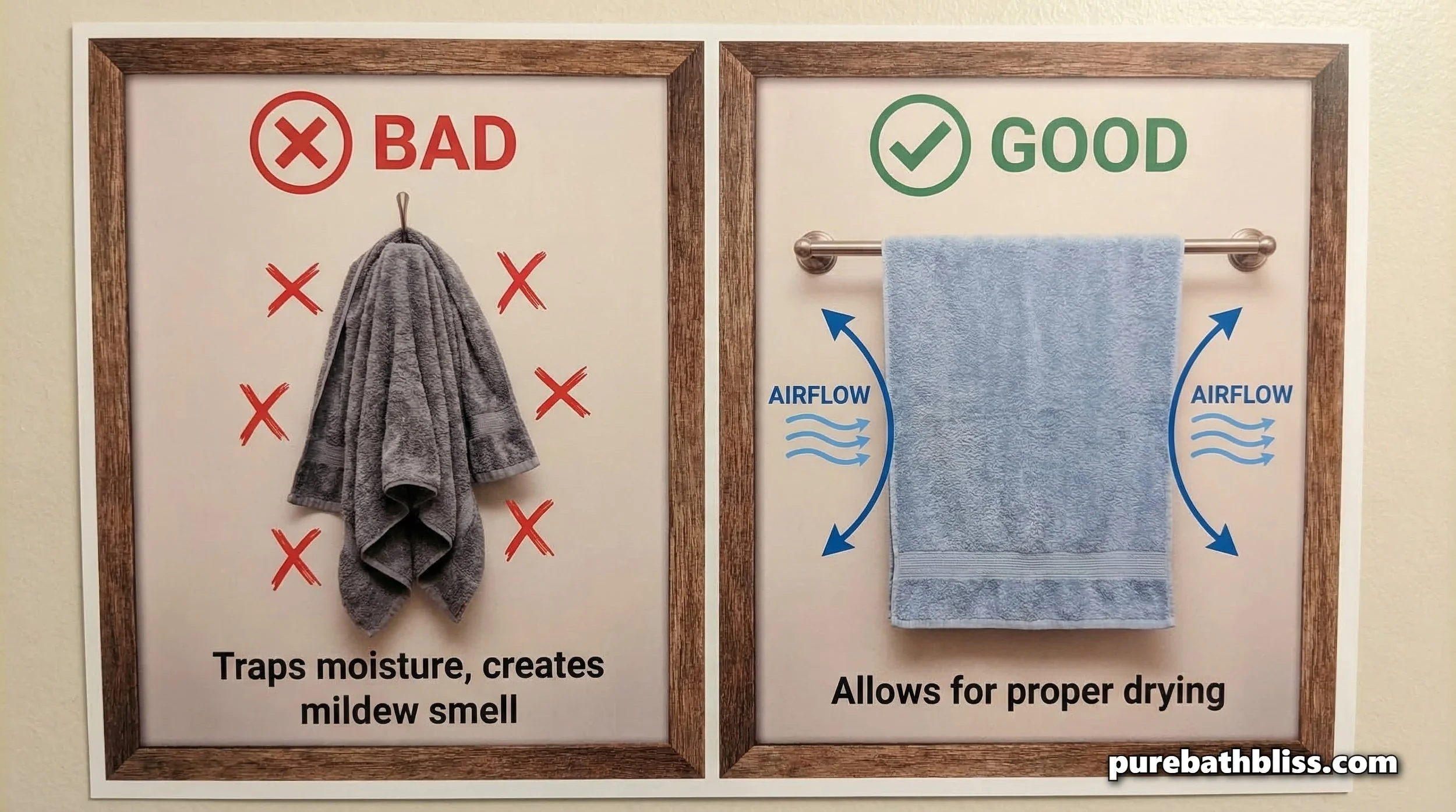 The Hook: When you hang a towel on a hook, the fabric bunches together. The air can only reach the outermost layers, while the folds in the middle stay wet and dark, the perfect environment for bacteria.