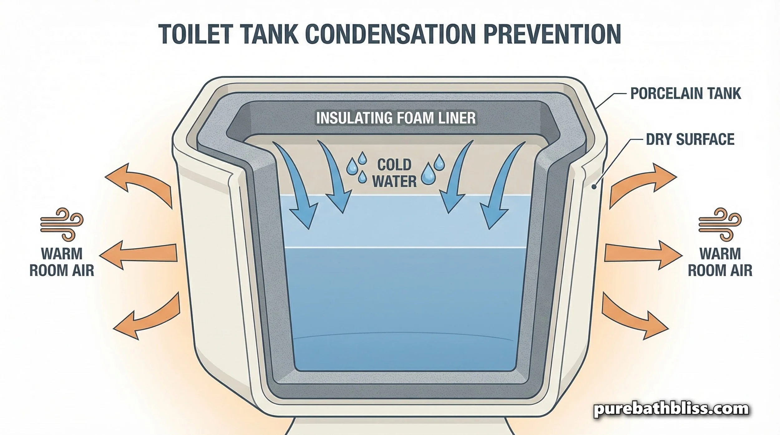 The foam acts like a wetsuit for your toilet. It keeps the cold water away from the porcelain, which keeps the outside of the tank at room temperature. No cold surface means no condensation.